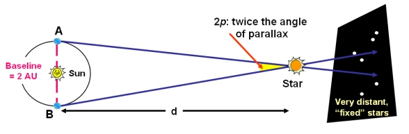 So, now that we have a little background about what parallax is, how do modern day astronomers do it? A spacecraft called the Hipparchus was launched in 1989 to catalog the stars. It used parallax to calculate the distances. Since the stars are so distant, you need a lot of distance between two observations to have any chance of observing parallax. For this, we measure the postition of the stars relative to the background at two opposite points on the Earth’s orbit, to increase the distance between the observations.