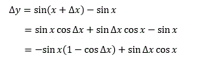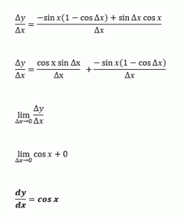 Now, this result might seem counter-intuitive, but, the limit of sin Δx/Δx as it tends to zero is 1 and the limit of (1-cosΔx)/Δx is 0.